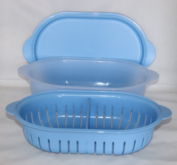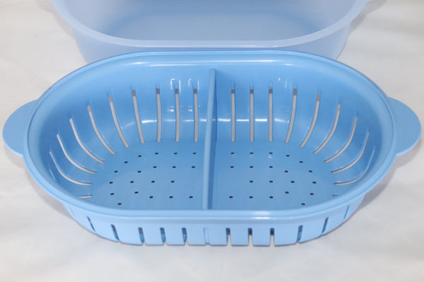 The product consists of - an oval container with two rounded handles, - an oval sieve that fits into the container, the sieve also has two rounded grips for handling, and includes a movable dividing partition, - a lid that can be used as a tray or as a separate serving dish.